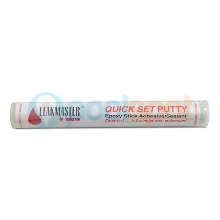 Hand-moldable epoxy putty in a convenient "one stick" format hardens above or below the water to an "off-white" color. Aggressive adhesiveness and a fast, 5-minute cure time make Leakmaster Quick Set the logical choice for a multitude of non-cosmetic repairs.